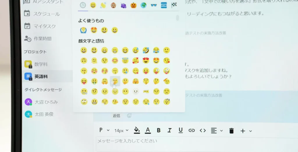 福原様:リアクションボタンというちょっとした機能もすごく便利で、例えば「見ました」「了解しました」というコメントをボタン一つでできるので、やり取りがスムーズにできるのも嬉しいですね。