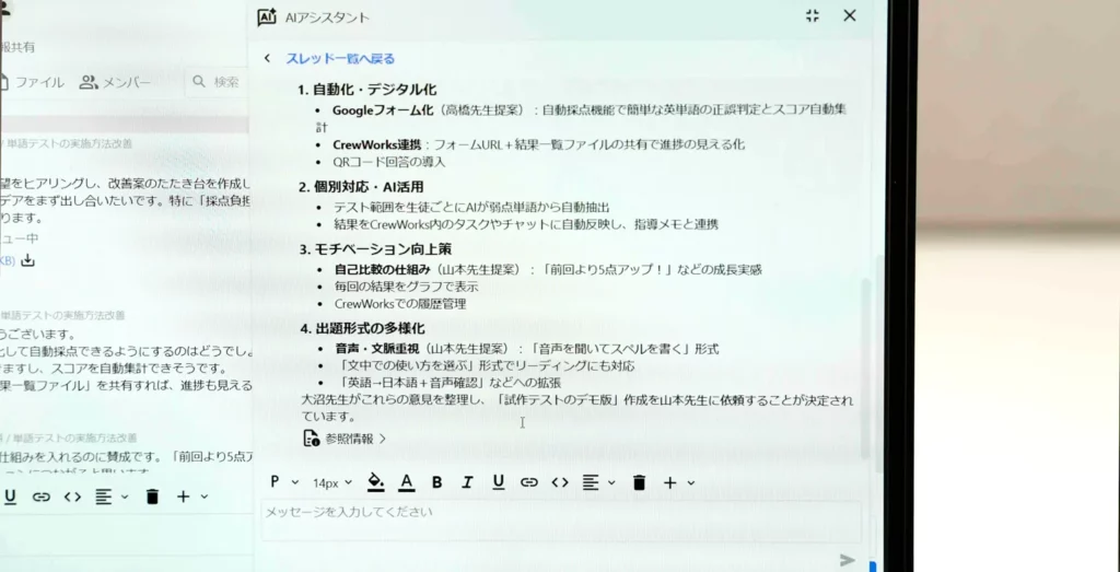 インタビューにご協力いただきありがとうございました。CrewWorksのチャットやスマホアプリがスタッフ同士の円滑なコミュニケーションに役立っており安心いたしました。チャットメッセージだけではなく教材等のファイルもたくさん共有いただくことで、AIアシスタントの参照元が増えてナレッジ活用がぐっと進むと思います。他にも会議のAI議事録やタスク管理など様々な機能がございますので、業務に合わせてぜひご活用ください!